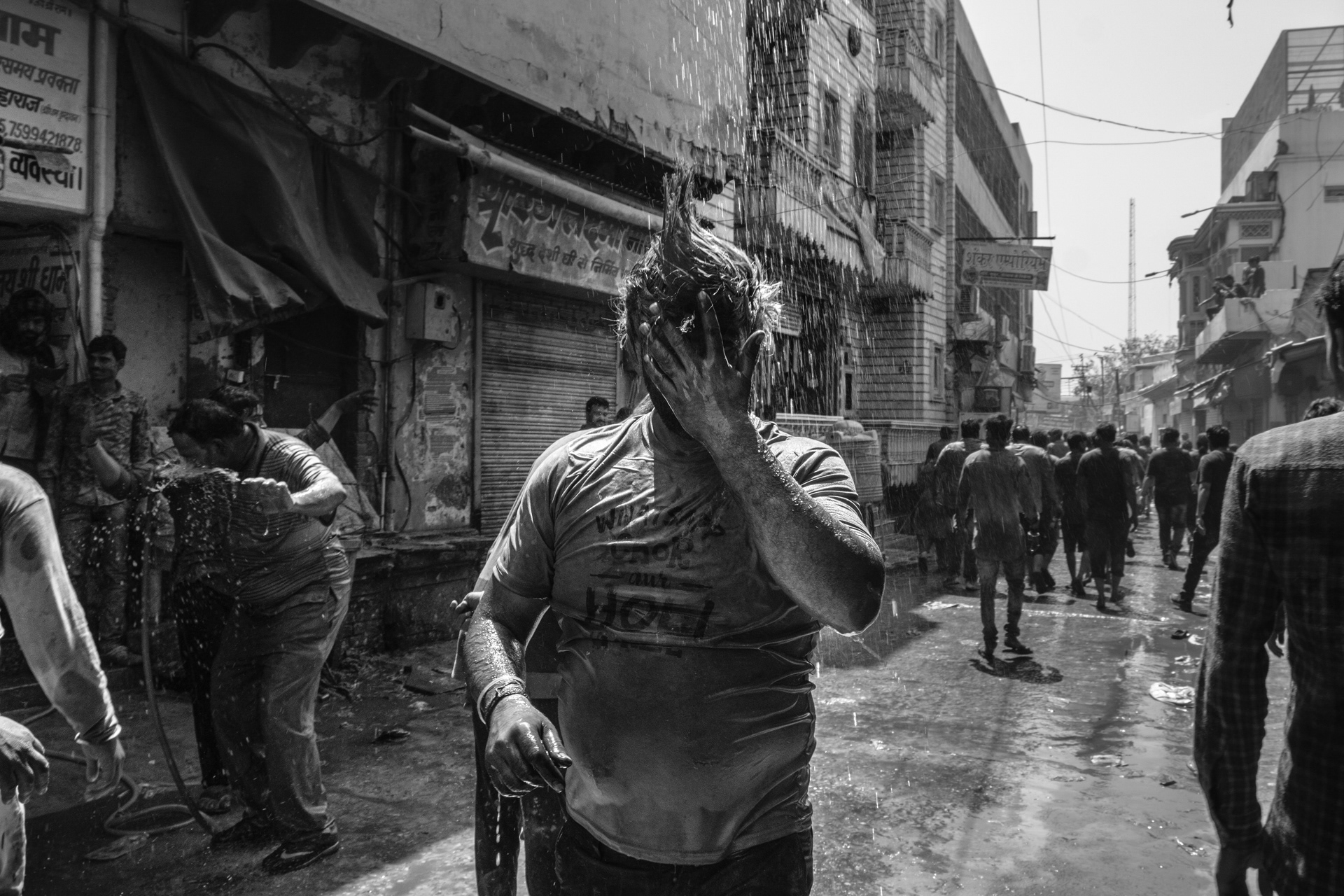 A dispetto d’ogni aspettativa di coinvolgimento nella festa, immergersi nell’Holi Festival è un modo per scontrarsi con una realtà caotica, affollata, a tratti insopportabile per via degli interminabili fiumi di uomini e donne colti da un’apparente irrazionalità, che finiscono comunque a determinarne il corso. Una volta in mezzo a quella marea colorata, a quella massa informe di anime esaltate, spinti oltre limiti accettabili, non resta che improvvisare soluzioni di fortuna. Ci si copre il volto per respirare nella speranza di trovare in fretta un vicolo, un pertugio, un riparo che possa offrire una boccata d’aria o un momento di tregua prima di tornare in mezzo agli altri, che ancora gridano Radhe!